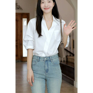 2025 夏のファッショナブルな V ネック白パフスリーブシャツ女性のデザイン半袖通勤多用途シャツ