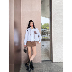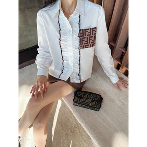 F 5604 春夏スタイル胸耳レースデザイン老眼ポケットコントラストカラーラペルブレストカジュアルシャツ