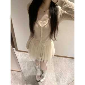 三件套女2025夏季新款纯欲甜辣妹镂空针织开衫吊带背心高腰半身裙