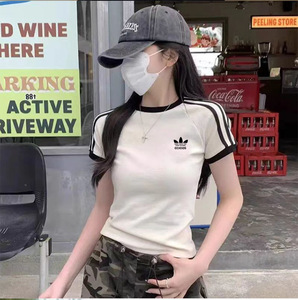 リブ生地クローバー刺繍スリムフィットラウンドネック半袖Tシャツレディース夏ピュアコットンショートトップストライプ
