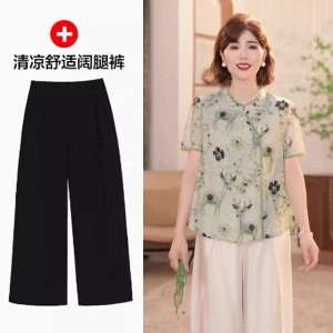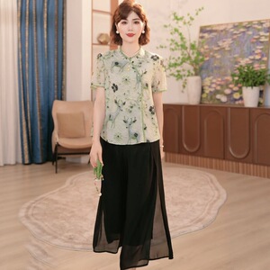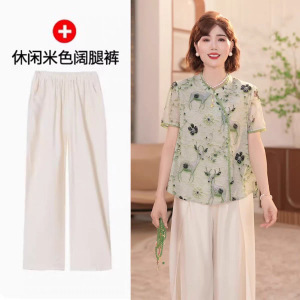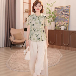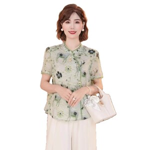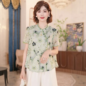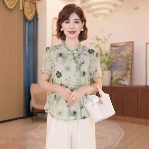 ママの中国風スタンドカラースーツ女性の夏の 2025 新しい C 中高年ファッション女性のプリントレトロレディースシャツ