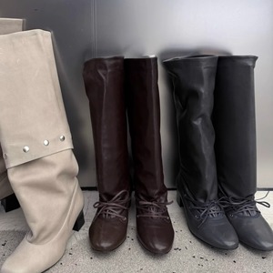 在庫あり~幅広ブーツ、ストラップ付き本革ハイヒールナイトブーツ、レトロラウンドトゥ太ヒールプリーツパイルブーツ
