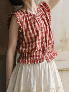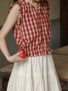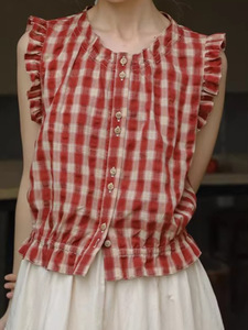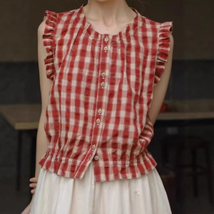 赤いチェック柄のノースリーブシャツ女性の夏のレトロな小さなフライングスリーブ耳デザインニッチな優しく快適なコットントップ