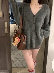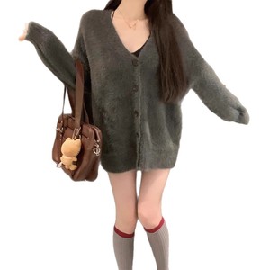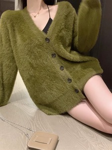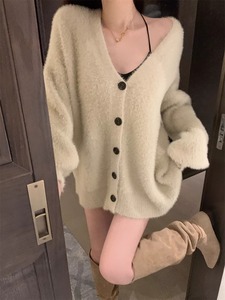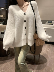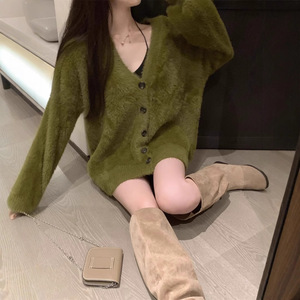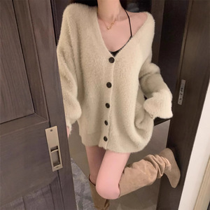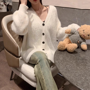 優しい風ミルクふふソフトワックス状ミンクベルベット V ネックセータージャケット女性の秋と冬のルーズモヘアニットカーディガン