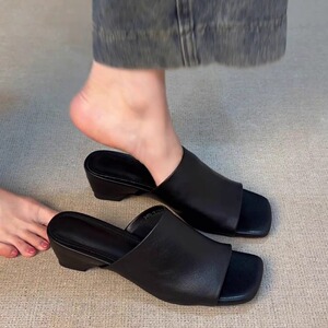 羊皮版~夏季新款法式复古软皮方头粗跟时尚简约一脚蹬露趾凉拖鞋