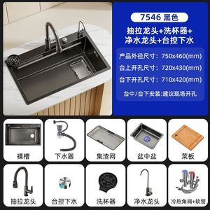 【双轨道+集渣】7546/纳米黑-3【洗菜盆+铜芯抽拉+净水龙头+洗杯器】