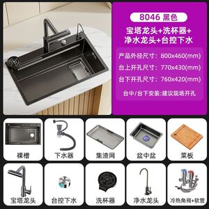 【双轨道+集渣】8046/纳米黑-4【水槽+4挡宝塔龙头+净水+洗杯器】