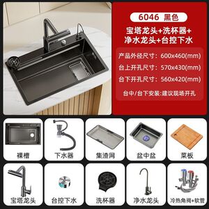 【双轨道+集渣】6046/纳米黑-4【水槽+4挡宝塔龙头+净水+洗杯器】