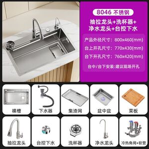 【双轨道+集渣】8046/不锈钢色-3【洗菜盆+铜芯抽拉+净水龙头+洗杯器】