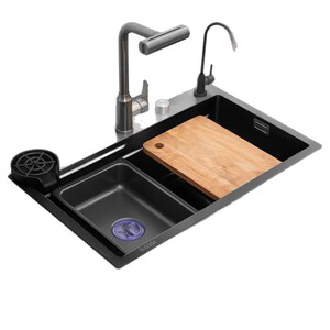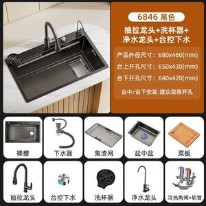 【双轨道+集渣】6846/纳米黑-3【洗菜盆+铜芯抽拉+净水龙头+洗杯器】