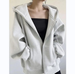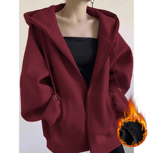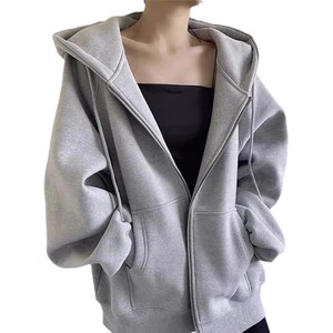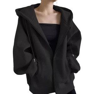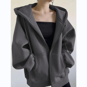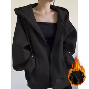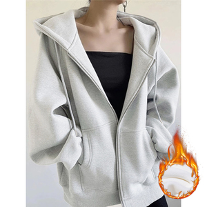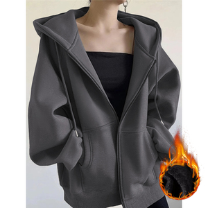 春と秋の女性のための純粋な綿のフード付きスウェットシャツ新しいハイストリートルーズでシンプルなインプラスベルベット厚みのあるカーディガンジッパージャケット女性用