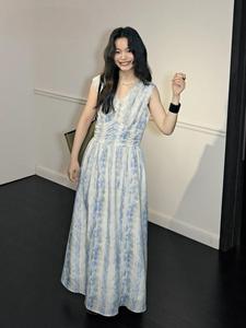 女性のためのワイドVネックウエストノースリーブベストドレス2025新しい夏のAライン気質ロングスカート海辺の服装