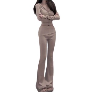 慵懒辣妹风连帽长袖修身针织卫衣开衫秋季高腰翻边微喇长裤两件套
