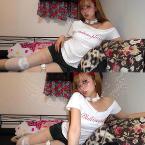彫刻家斜め襟オフショルダーホットガールベルト付きショート Tシャツ 2025 夏の女性のインルーズプリント半袖トップ