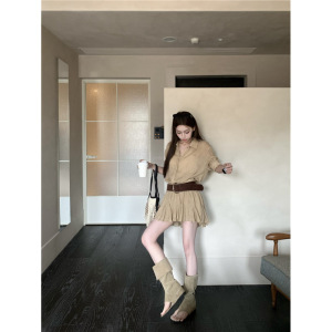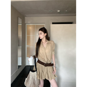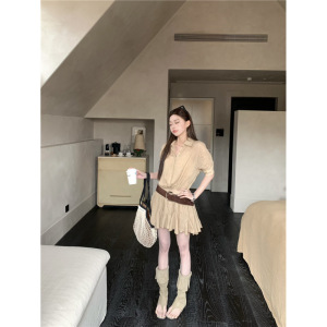 夏らしい薄手のフレンチスタイルの小柄な女性向けワンピース、カーキ色の切り替えデザイン、半袖シャツ、プリーツスカート、長袖