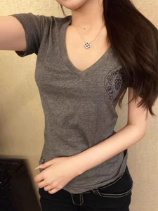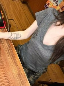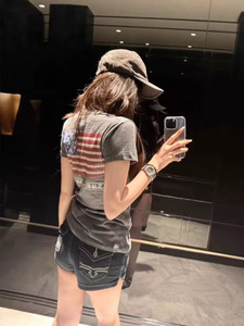 [92 コットン 8 スパンデックス] ピュア ディザイア V ネック スター ストライプ プリント ウエスト グレー 半袖 T シャツ レディース スリム ハイストリート ダンス