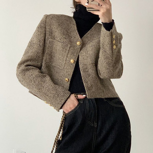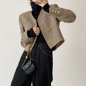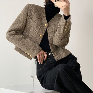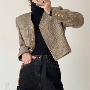 美拉德咖色短外套女法式新款名媛气质小香风粗花呢长袖夹克上衣