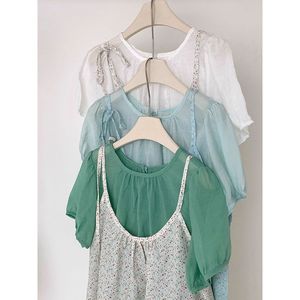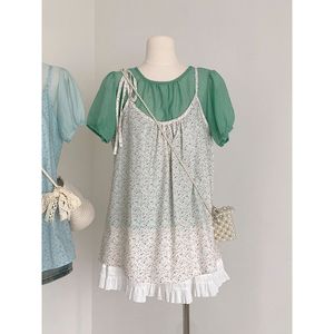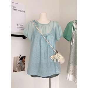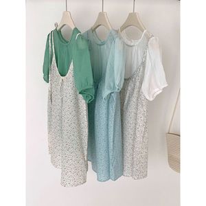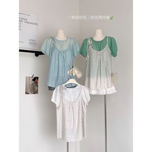 韓国ヴィンテージ風薄手ゆったり半袖ブラウストップス女性用重ね着甘い花柄サスペンダーサマービューティーセット