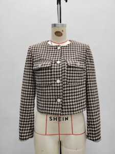 クラシックなヨーロッパとアメリカのラウンドネックメタルバックルダブルポケット装飾クラシックな黒と白の千鳥格子ツイードジャケット