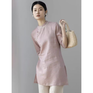 リネン新中国風ラウンドネックミッドスリーブ刺繍トップ 2025 夏新文学レトロルーズミッドレングスシャツ