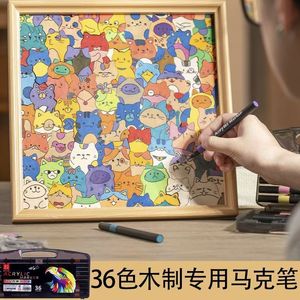 手绘可爱猫咪相框拼图+36色马克笔-木质益智积木手绘涂色拼图+胶水+图纸