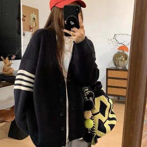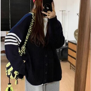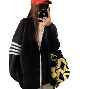 2025新款韩版拼色条纹V领针织开衫休闲慵懒宽松大版型毛衣女外套