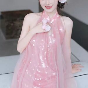新中式晨袍女新娘当天便装小众轻婚纱气质粉色亮片露背挂脖连衣裙