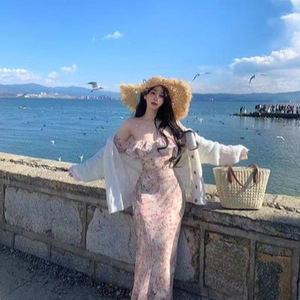 海辺のリゾートスタイルのティーブレイクドレス、女性用バックレス花柄ドレス、夏のウエスト痩身ロングドレス