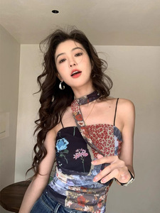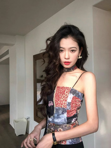 アメリカンレトロプリントチューブトップ女性のための夏 2025 新しいプリーツデザインニッチ気質メッシュシャツ