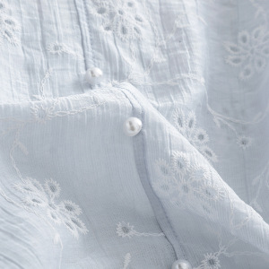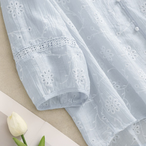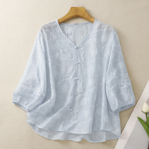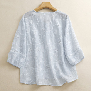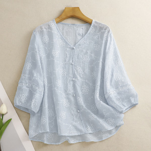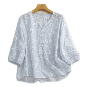 風が吹くハーフサマーVネックパールボタン通気性、快適、スリム中空2025新しいスタイルの花刺繍シャツ
