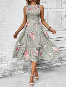 2025年夏 花柄プリント ノースリーブ ラウンドネック タイトワンピース ハイウエスト 細見えデザイン 越境欧米人気商品