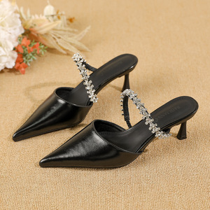 2025 新しい夏のポインテッドトゥ浅い口白薄型ハイヒール女性のサンダルセクシーな包頭ラインストーン気質サンダル