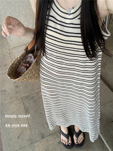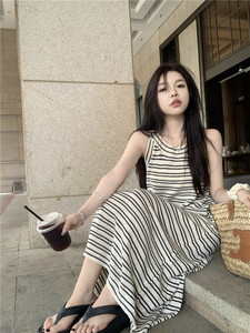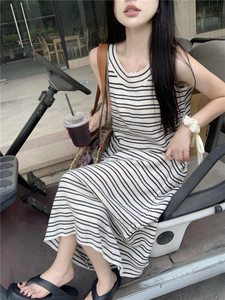 ストライプキャミソールニットドレス女性の 2025 夏ルーズカジュアル Tシャツ膝丈ビーチロングスカートトレンディ