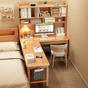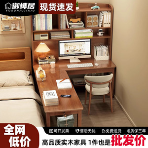 实木转角书桌书架一体卧室半包围电脑桌带书柜组合简约写字学习桌