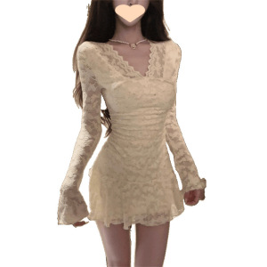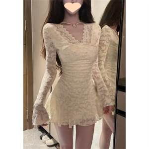 韩系纯欲风时尚褶皱蕾丝花边领长袖连衣裙女2025秋季新款裙子