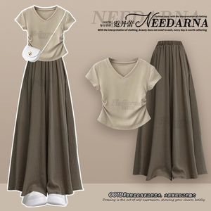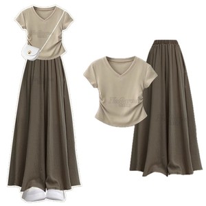 2025年新作 フレンチスタイル 夏コーデ レディース スリムフィット半袖Tシャツとゆったりワイドスカートパンツのツーピースセット