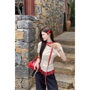 レッドチェック柄オフショルダー半袖Tシャツレディース2025新作不規則デザイントップス