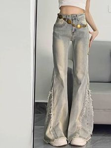 美式复古辣妹毛边修身微喇牛仔裤女新款高腰显瘦直筒马蹄喇叭裤子
