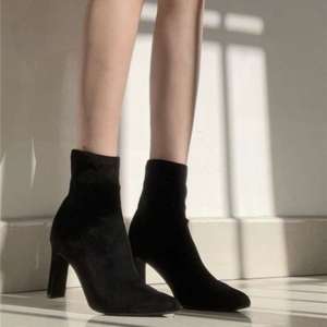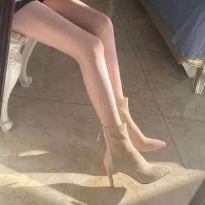 韓国風アンクルブーツ太ヒールショートブーツ女性用2025秋冬新作アプリコットポインテッドトゥハイヒールショートブーツスリムブーツ
