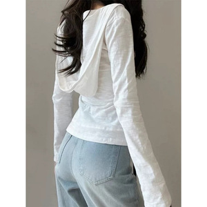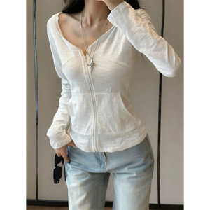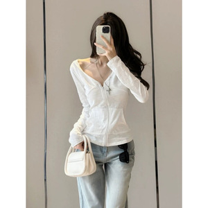 ホワイト V ネック長袖 Tシャツ日焼け止めシャツ女性の夏のホットガールジッパーフード付きカーディガンデザインポケットジャケットトップ