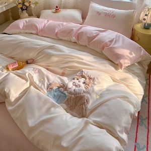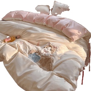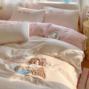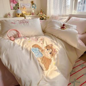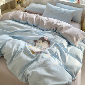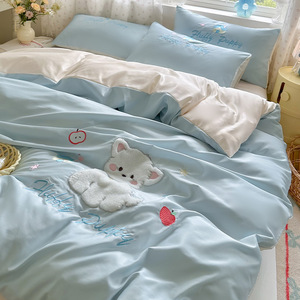 サマーアイスシルクベッド4点セット、サマーシルキーキルトカバーシーツ、ウォッシュドワッペン刺繍ドミトリーベッド3点セット