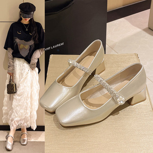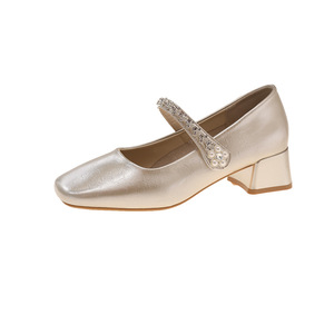 夏の新作シングルシューズ、スクエアトゥ、浅いラインストーン、シルバーのローヒールフラットシューズ、快適なメリージェーンシューズ