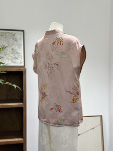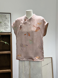 新しい中国風レーヨン香りの雲糸オーダー改良されたチャイナドレストップ女性の斜め襟小さなフライングスリーブ小さなシャツ夏の国民風ピンク