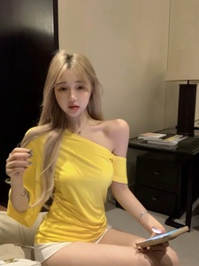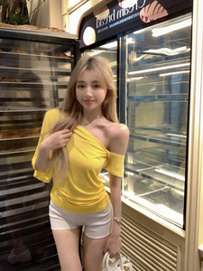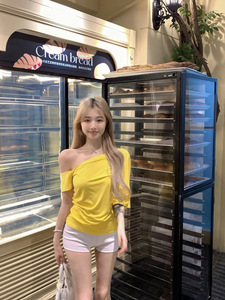 ホットガールイエローオフショルダー半袖Tシャツレディース夏スリムモーダルスリム不規則な多用途ソリッドカラートップ