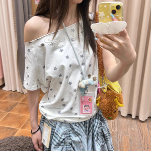 Sweet Hot Girl Pure Desire Star フルプリントオフショルダー Tシャツ女性用 2025 夏新作ニッチルーズオフショルダー半袖トップ