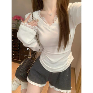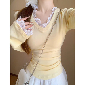 純綿ミルクイエローレースステッチVネックボトリングシャツ女性用春純粋な欲望甘いホットガールスリムフィットインナー長袖トップ