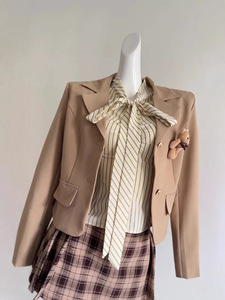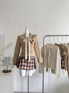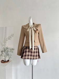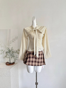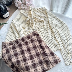 『欣幸』麻吉麻吉藤校学妹風リボン付きストライプ長袖シャツとチェック柄スカートのセット