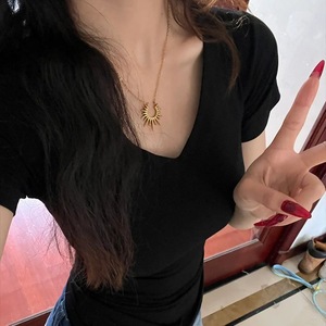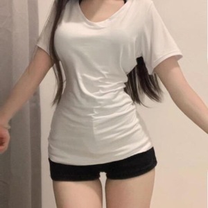 夏の純綿白ベーシック右肩Vネック半袖Tシャツレディーススリムウエスト痩身お腹カバーホットガールトップ