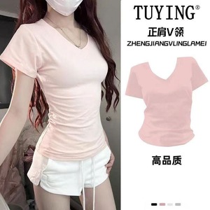 アメリカンVネックピュアコットン右肩夏半袖Tシャツレディース白スリムフィットホットガールボトリングシャツトップ