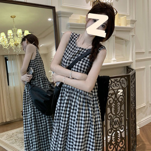 フレンチレトロな気質スリムチェック柄ベストドレス2025春夏新作ゆったりリゾート風ロングスカート
